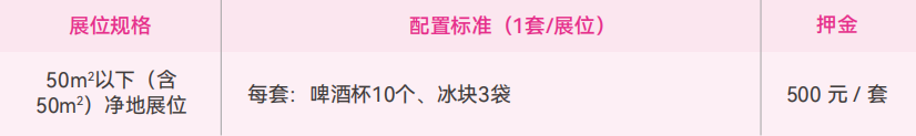 4-1.配套设施租赁 国际葡萄酒及烈酒展区酒具配送服务 本届糖酒会期间,组委会将根据展位规格的不同向国际葡萄酒及烈酒展区净地展位和标准展位的参展单位免费配置不同标准数量的酒杯、冰桶、醒酒器等相关基础物品。若组委会免费配置的物品仍不能满足参展单位使用需求,参展单位可在全国糖酒会设立的酒具服务处另行租赁或购买。 服务对象: 国际葡萄酒及烈酒展区参展单位 服务时间: 2025年10月15日13:00开始领取 2025年10月16日-18日08:30-17:00配置服务时间 2025年10月18日12:00以后物品开始清退 服务联系人: 有酒具物品租赁或购买服务需求的参展单位请联系国际葡萄酒及烈酒展区主场服务商 联系人:陈舒琪 电 话:185 0695 5828 箱:cshugi@xicec.com由B 联系人:林晓萱 电 话:173 5927 2928 邮箱:lxiaoxuan@xicec.com 物品配置标准及服务流程 (1)配置标准 国际葡萄酒及烈酒展区净地展位和标准展位均按下表分别免费配置酒具等相关物品: 1.国际葡萄酒及烈酒展区物品配置表(国家或地区团除外)