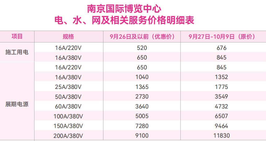 24小时用电 展览期间24小时供电,在标准收费价目上加收50%。 1.10月10日及以后,现场临时申请用电,按现场申报的基础上加收50%; 2.布展期为4天,每增加一天临时用电,费用增加170元; 3.对于已按要求安装到位的电源移位服务申请,将按原申请服务项目价格的50%的收取变更施工费: 4.在9月26日及之前申请,请选择9月26日及之前价格,在9月27日至10月9日申报请选择9月27日至10月9日价格; 5.室外用电每处加收130元安装接驳费