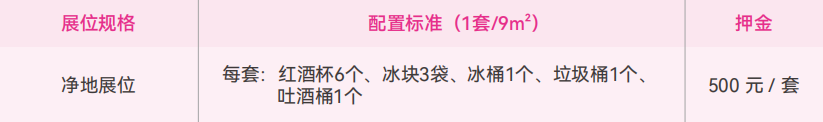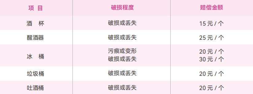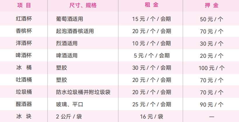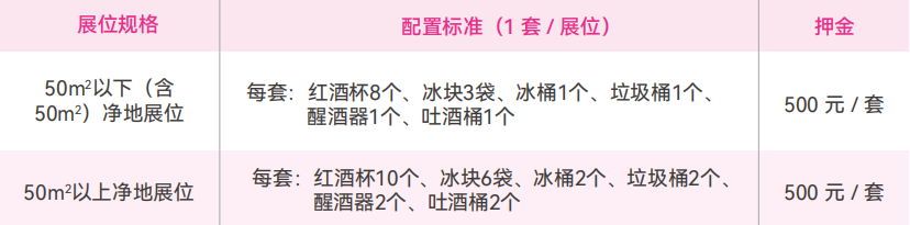 备注: A.国际葡萄酒及烈酒展区净地展位和标准展位均按上述标准分别免费配置酒具等相关物品,使用单位应按上述标准缴纳押金: B.免费提供上述标准配置内的酒杯清洗更换服务; C.1套垃圾桶包含1个垃圾桶和10个垃圾袋; D.若参展单位无物品配置需求,则组委会不予配置,也无须缴纳押金: E.配置服务为期三天(即2025年10月16日-18日) (2)配置物品赔偿标准