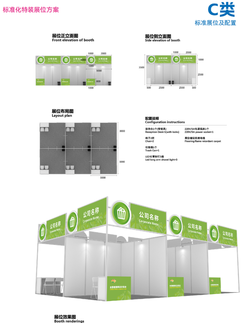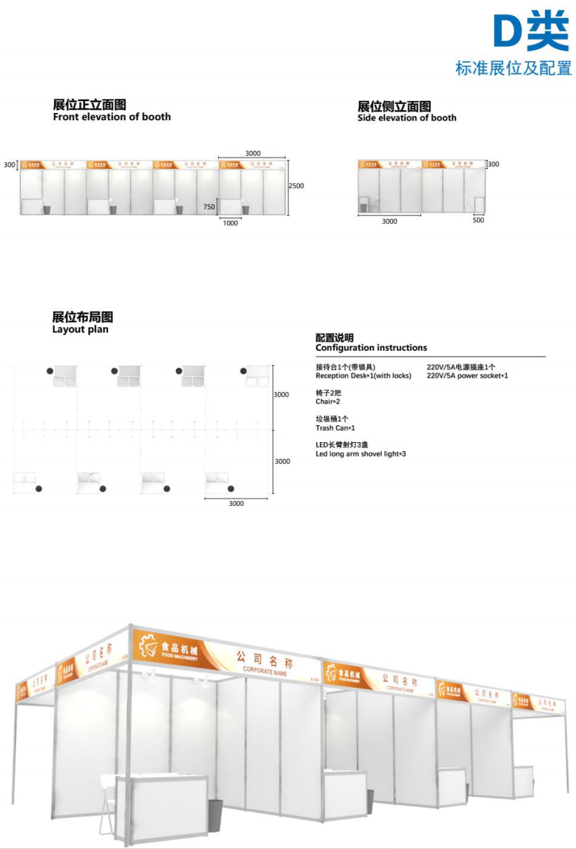 1.布展期规定时间外施工搭建视为加班,清场后需凭加班凭证再次进场施工。布展期间申请当日22:00前加班,请于当日16:00前按标准办理加班手续:申请22:00后加班,请于当日21:00前按标准办理加班手续,缴纳加班费; 2.加班申请以每个特装展位为申报单位,每个特装展位的展位面积不得拆零申报加班: 3.加班起始时间为加班不足1小时按1小时计算,以此类推; 4.净地展位提前进场须征得组委会及主场服务商书面同意,并在展馆与组委会交接场馆完毕后方能进场。 5.灭火器按2具/50m?配备,50m以下按50m?计算,50m以上按实际面积计算,每增加50m增加2具阻燃剂按1kg/10m计算,玻璃及木板地台无需申请此项;6. 7.净地施工保证金已包括灭火器保证金,不再单独收取: 8.展会结束后,若未退灭火器则按100元/具的标准扣除净地施工保证金。 9.布撤展证申请,每5m?不能超过1张。 10.上述礼仪模特价为起步价,翻译价为英文翻译价。 注意:10月15日17:00将闭馆实施消防安全检查,不予办理加班。收费明细表中的项目下单后概不退换。 4-4.标准展位配置及说明 (1)净地展位配置:除国际葡萄酒及烈酒展区(包括国家或地区展团)的净地展位有酒具等物品配置服务外,其余展区净地展位均无任何配置。 (2)C、D类标准展位配置:(所有效果图仅供参考,以*终现场实物为准)备注:标准展位配备用电仅供小电器使用,功率不得超过300w,如需使用大功率用电请额外申请。